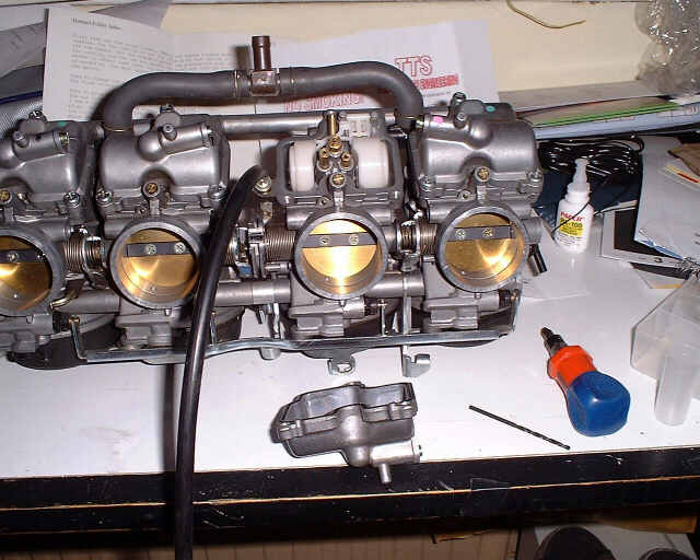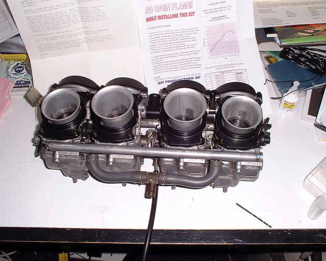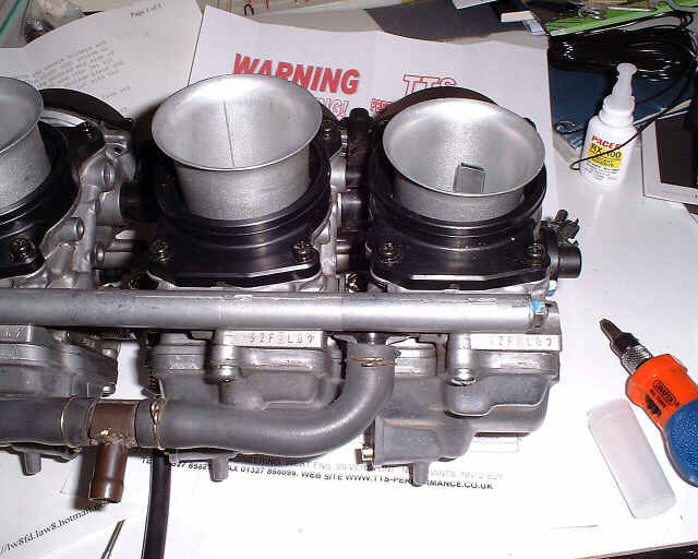 The Blackbird engine uses 4 carbs, one for each cylinder. They are set up for use with the standard bike airbox and exhaust and when used in a car installation with a freer-flowing filter and exhaust the jets need changing on the carbs. I got a kit from TTS including a filter and the rejetting kit. I'm not using the filter at the moment as it would require a hole in the bonnet. I'm going to wait to do some tests to see how much extra power would be liberated before taking jigsaw to GRP. If you don't use the bike airbox (i.e. socks or sausage filter) and don't rejet it then it won't rev properly. And what would be the point of that.....