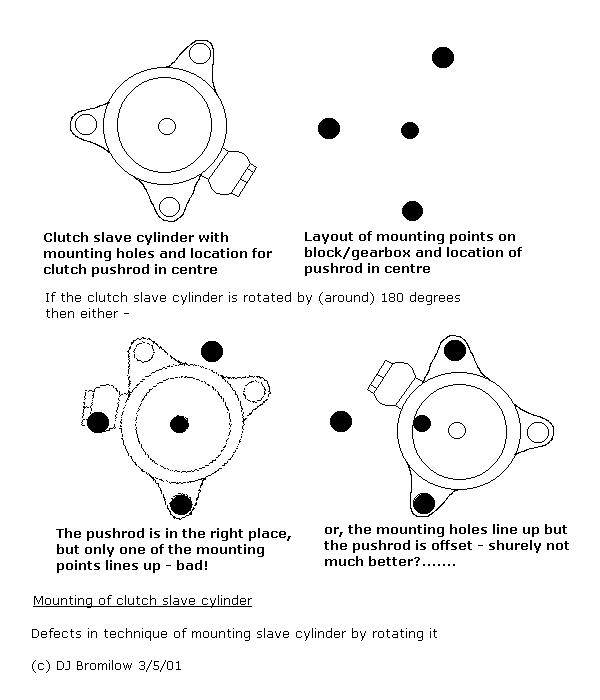 I didn’t use this technique as, as far as I can see, it’s fundamentally flawed since the mounting points on the slave cylinder are not symmetrical (as you can see from the diagram). This means that either the clutch pushrod is not going to line up with the slave cylinder properly, or the studding is going to have to be bent into place. I took the view that this would weaken the slave cylinder mounting and was likely to put lateral forces on the pushrod. No doubt an adaptor plate could be made up but I didn’t fancy going to those lengths.