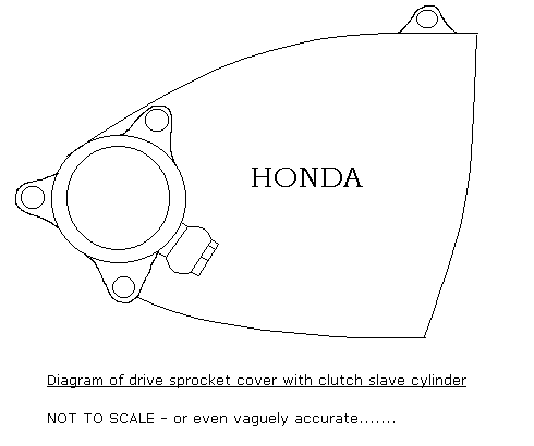 The clutch on the Blackbird engine is hydraulic which complicates matters. The clutch itself is at the front of the engine (that is, the end nearest the nose of the car) but is activated by a pushrod which runs right through the engine/gearbox unit. The pushroad is actuated by a hydraulic slave cylinder. This is located to the left of the drive sprocket cover. The diagram below is a rough sketch of the drive sprocket cover and slave cylinder.