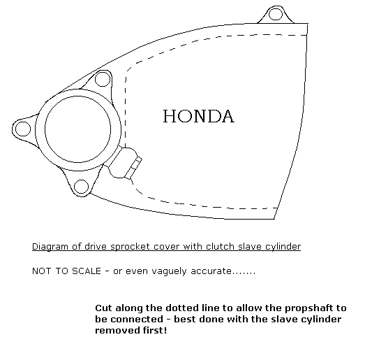 The second option is the one I was advised to use by Fisher. This involves binning the drive sprocket cover altogether. Then using (I think) two of the slave cylinder mounting holes, 2 lengths of threaded studding are inserted in the threaded mounting holes, spacers made of tubing are slid over the studding, and the slave cylinder is mounted on the 2 lengths of studding. HOWEVER, the slave cylinder is turned round 180 degrees so that the banjo connector, instead of pointing towards (and into!) the propshaft, is pointing away from it.